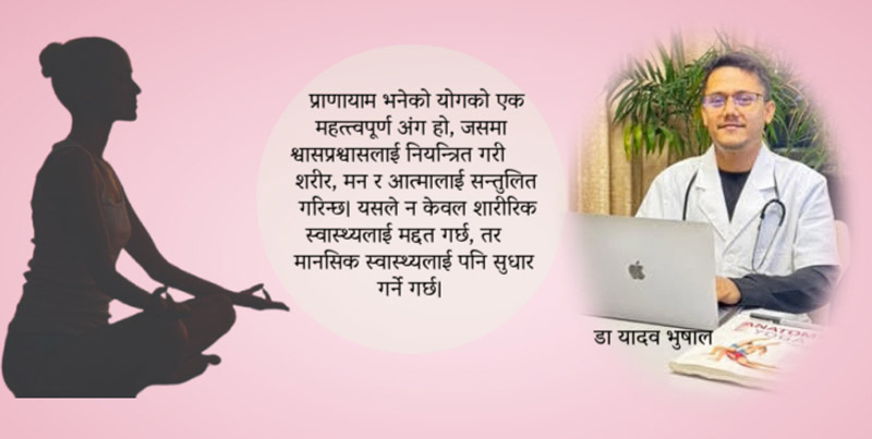 काठमाडौं — श्वासप्रश्वासलाई नियन्त्रित गर्दै शरीर, मन र आत्मालाई सन्तुलित बनाउन प्राणायाम योगको महत्त्वपूर्ण अभ्यास हो। यसले शारीरिक मात्र नभई मानसिक स्वास्थ्यमा पनि गहिरो प्रभाव पार्ने वैज्ञानिक अध्ययनहरूले पुष्टि गरेका छन्। विशेष गरी तनाव र डिप्रेसन कम गर्न प्राणायाम प्रभावकारी रहेको विभिन्न अनुसन्धानहरूले देखाएका छन्।